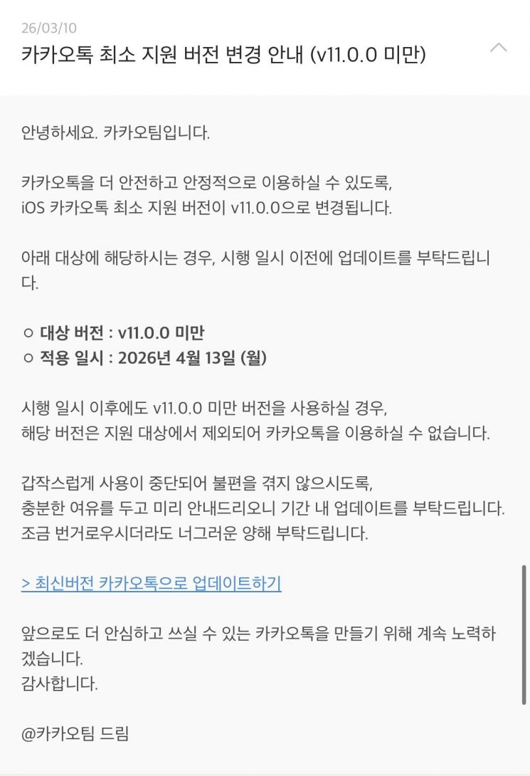 카카오는 시행일 이후에도 v11.0.0 미만 버전을 사용할 경우 해당 버전은 지원 대상에서 제외돼 카카오톡을 이용할 수 없다고 설명했다. 카카오 카카오 close 증권정보 035720 KOSPI 현재가 50,600 전일대비 1,000 등락률 +2.02% 거래량 1,290,032 전일가 49,600 2026.04.16 15:30 기준 관련기사 미토스發 '보안 쇼크'…"AI 공격에 AI로 방어해야" [클릭 e종목]"카카오, 새 성장동력 필요...목표주가 하향" [특징주]광고 고성장·수익성 개선 기대…카카오 3.09%↑ 는 공지에서 "갑작스럽게 사용이 중단돼 불편을 겪지 않도록 충분한 여유를 두고 미리 안내하니 기간 내 업데이트를 부탁드린다"고 당부했다.