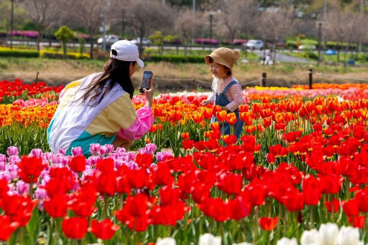 서울 동대문구 중랑천 사계정원이 튤립으로 화사하게 물들었다. 장평교 하부 둔치 일대 4개 구간에 31종 7만1000본의 튤립이 만개했다. 붉은색·분홍색·노란색 등 색색의 꽃이 산책로 바로 옆을 따라 길게 이어져, 평소 스쳐 지나던 하천 둔치가 봄 나들이 명소로 바뀌었다.