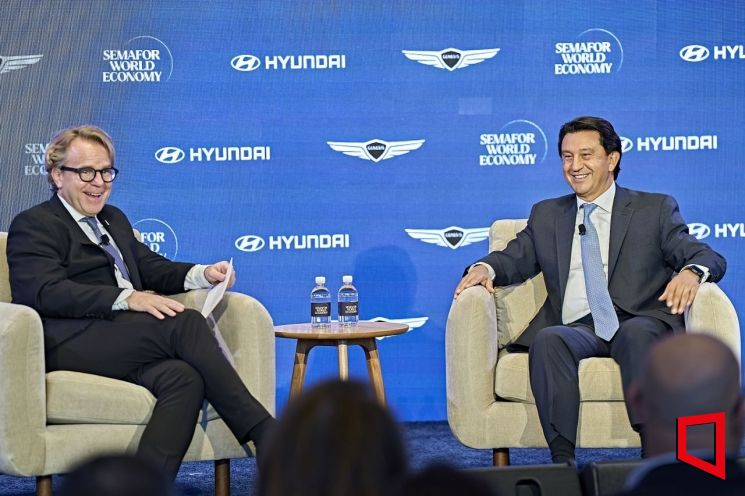 호세 무뇨스 현대차 사장(오른쪽)이 14일(현지시간) 열린 '2026 세마포 월드 이코노미' 미래 모빌리티 트랙 세션에서 저스틴 스미스 세마포 공동창업자와 대담하고 있다. 현대차