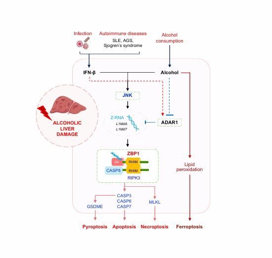 또 JNK(세포 스트레스 신호 경로) 신호 경로 억제제를 투여했을 때도 간 손상이 감소했다. 알코올과 염증이 함께 작용하면 JNK 경로가 활성화되고, 이 과정에서 Z-RNA가 만들어져 ZBP1이 켜진다는 점도 이번에 새롭게 밝혀졌다.