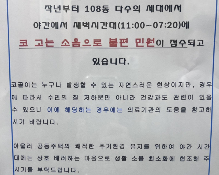 공문에는 "작년부터 108동 다수의 세대에서 야간에서 새벽 시간대(오후 11시~오전 7시 20분)에 코 고는 소음으로 불편 민원이 접수되고 있다"며 "야간 시간대에는 상호 배려하는 마음으로 생활 소음 최소화에 협조해 달라"고 적혀 있었다. 이어 "이에 해당하는 경우에는 의료기관의 도움을 참고하시기 바란다"고 덧붙였다.