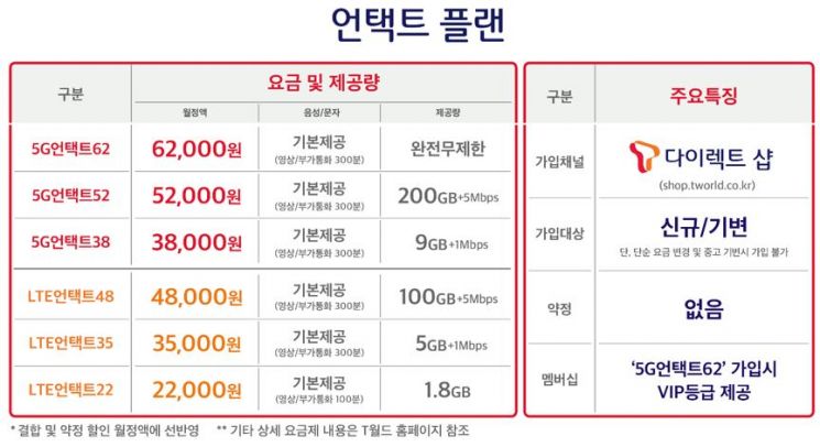 이번 요금제는 ‘언택트 플랜’이 1인 가족 및 비대면 채널의 중요성이 강조되는 사회적 트렌드를 고려해 이동통신 서비스 요금에 대한 고객의 선택권을 강화한 것에 의미가 있다는 평가다. 해당 요금제는 T다이렉트샵에서 신규(번호이동 포함)?기기변경 시 가입할 수 있으며, 자급제(OMD) 단말 및 유심 단독 개통시에도 가능하다. 다만 단순 요금변경 및 이통사향(OEM) 단말 중고 기변의 경우는 가입할 수 없다.