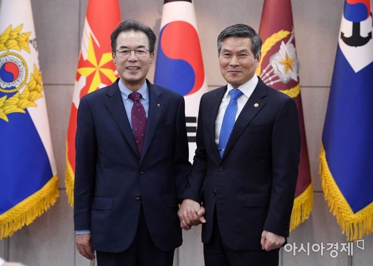 Defense Minister Jeong Kyeong-du (right) and NongHyup Central Association Chairman Lee Seong-hee are taking a commemorative photo on the 19th at the Ministry of National Defense in Yongsan-gu, Seoul, during the NongHyup Central Association Chairman Meeting and Appreciation Plaque Presentation Ceremony. This event was held to express gratitude for active business support related to the 'June 25 War Casualty Family Sample Collection MOU Agreement' and to strengthen cooperation following the chairman's inauguration. / Reporter Kim Hyun-min kimhyun81@