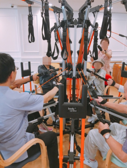 Body Spider is a full-body exercise device that uses the elasticity of rubber ropes for resistance training, helping to activate muscle strength, walking, balance ability, and brain activity in the elderly, thereby aiding dementia prevention.