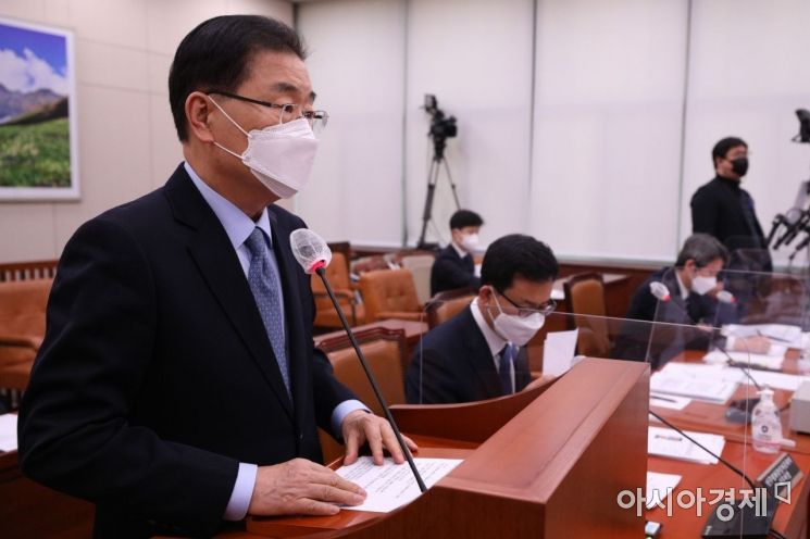 Foreign Minister Chung Eui-yong is attending the full meeting of the Foreign Affairs and Unification Committee held at the National Assembly on the 18th, providing a work report./Reporter Yoon Dong-joo doso7@