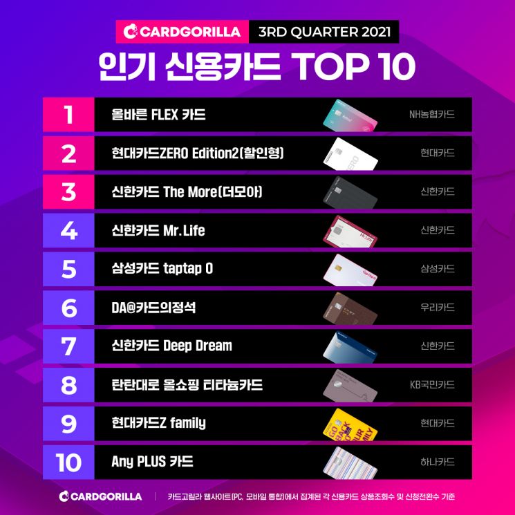According to Card Gorilla, the largest credit card specialist site in Korea, the 'NH Nonghyup Olbareun FLEX' card was selected as the most popular credit card in the third quarter of this year. This ranking was based on the number of views and application conversions for each credit card product on the Card Gorilla website (PC and mobile combined) from July 1 to September 24.