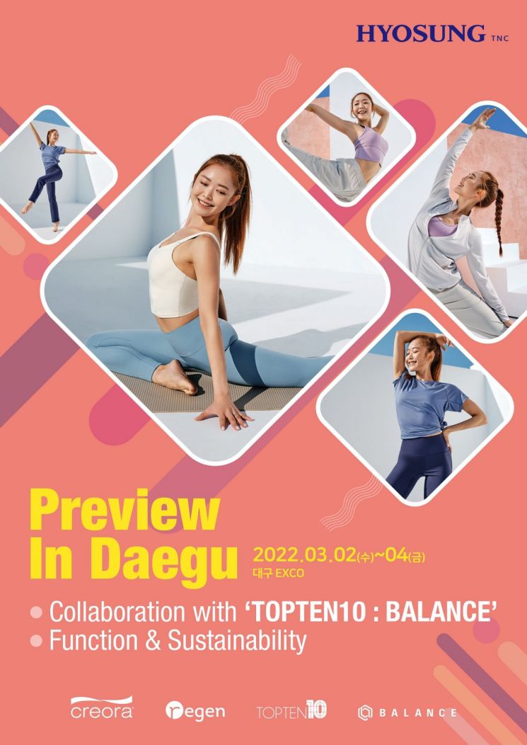 At the exhibition, Hyosung TNC will collaborate with Topten, a leading domestic SPA brand, to jointly set up an exhibition booth and showcase a large number of Topten's 'Balance' products such as leggings and pants. The newly launched Topten Balance products feature Hyosung TNC's differentiated spandex fiber, 'Creora Powerfit.' Creora Powerfit enhances functions such as heat resistance and elasticity, and is used in sports and leisure products like yoga wear.