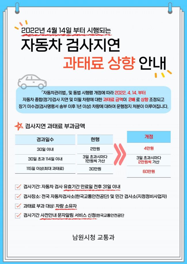 [Namwon=Asia Economy Honam Reporting Headquarters Reporter Jeong Young-kwon] Namwon City, Jeonbuk, announced on the 24th that starting from the 14th of next month, the penalty fees for delayed vehicle inspections will be increased due to the revision and enforcement of the 'Automobile Management Act' and its enforcement decree.