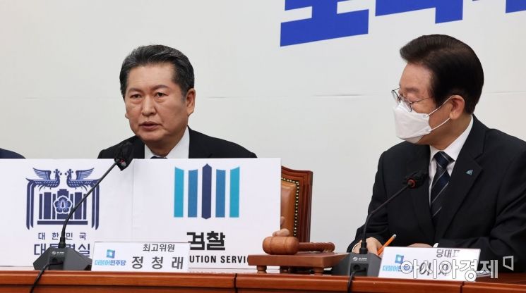 View original image[Asia Economy Reporter Yoon Dong-joo] Jeong Cheong-rae, Supreme Council Member of the Democratic Party of Korea, spoke about the new logo of the Presidential Office and the logo of the prosecution during the Supreme Council meeting held at the National Assembly on the 24th.