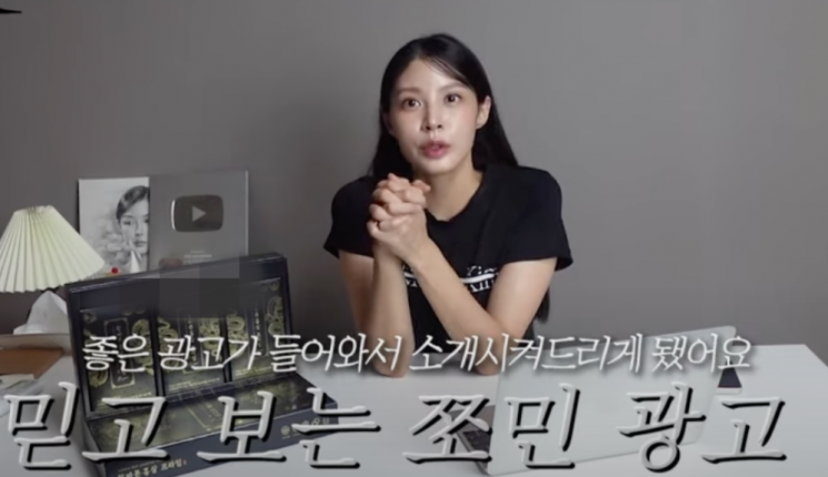 In the 8-minute and 9-second video, Cho Min revealed the Silver Button she received from YouTube for reaching 100,000 subscribers and introduced a red ginseng gift set, saying, "I received a good advertisement offer, so I am introducing it." The subtitles read, 'Trusted Jjomin advertisement.'