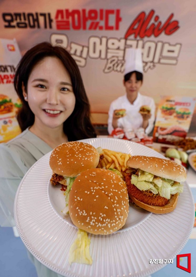 On the 30th, promotional models at the Lotteria Sookdaeipgu Station branch in Yongsan-gu, Seoul, are showcasing the newly released "Ojingeo Alive Burger." The Ojingeo Alive Burger combines the patty of Lotteria's first legendary burger, the Ojingeo Burger, with fried squid legs.