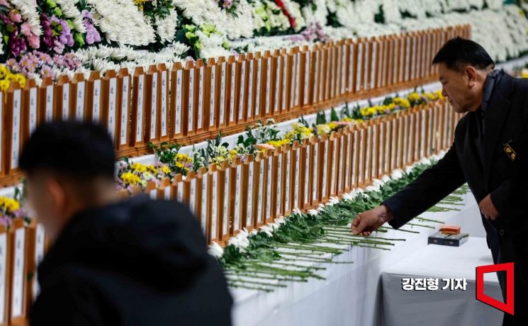 Amid the Jeju Air passenger plane disaster that resulted in 179 deaths, a mourner visiting the joint memorial altar set up at Muan Sports Park near Muan International Airport in Jeollanam-do on the 30th is touching the memorial tablet of the victims. Photo by Kang Jin-hyung