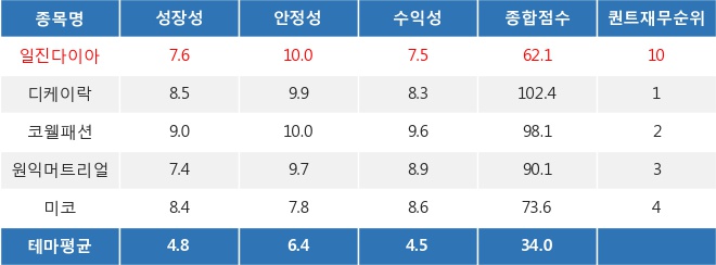According to the analysis by Thinkpool Robo Algorithm RASSI, Iljin Diamond ranked 10th out of 52 stocks in the quant financial ranking by exceeding the theme's average scores in growth, stability, and profitability. This can be interpreted as Iljin Diamond having relatively high investment attractiveness compared to other stocks within the theme from a financial perspective.