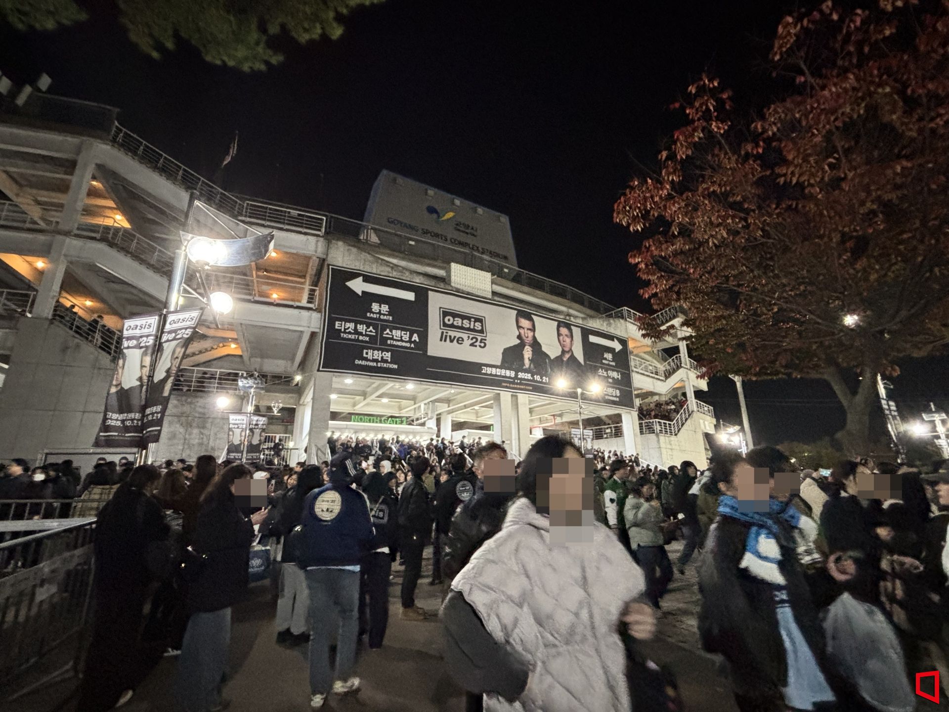 영국 밴드 오아시스가 16년 만에 고양종합운동장에서 내한 공연을 펼친 21일, 공연장 외부에서는 또 다른 풍경이 펼쳐졌다. 동문과 서문 근처 계단 양쪽으로 돗자리와 미니 텐트를 펴고 자리를 잡은 인파가 눈에 들어왔다. 굿즈 티셔츠를 입고 벙거지를 쓴 20대 관객들이 대부분이었고, 이들은 캔맥주와 치킨을 나눠 먹으며 공연 시작을 기다렸다. 본 공연이 시작되자 이들은 자리에서 일어나 어깨동무를 하고 원을 돌거나 점프하며 떼창을 이어갔다.
